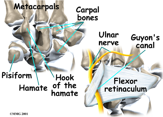 The hamate bone forms one side of Guyon's canal. This bone has a small hook-shaped spur that sticks out to provide an attachment for several wrist ligaments. Known as the hook of hamate, this small bone can break off and press against the ulnar nerve within Guyon's canal.