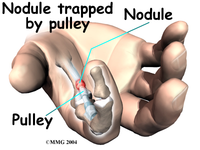 The clicking sensation occurs when the nodule moves through the tunnel formed by the pulley ligaments. With the finger straight, the nodule is at the far edge of the surrounding ligament. When the finger is flexed, the nodule passes under the ligament and causes the clicking sensation. If the nodule becomes too large it may pass under the ligament, but it gets stuck at the near edge. The nodule cannot move back through the tunnel, and the finger is locked in the flexed trigger position.