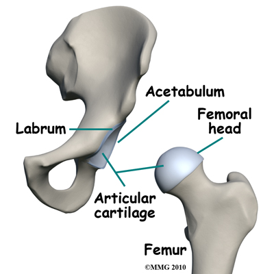 It's even referred to as a pistol grip deformity. The femoral head isn't round enough on one side (and it's too round on the other side) to move properly inside the socket. The result is a shearing force on the labrum and the articular cartilage, which is located next to the labrum. The labrum is a dense ring of fibrocartilage firmly attached around the acetabulum (socket). It provides depth and stability to the hip socket. The articular cartilage is the protective covering over the hip joint surface.