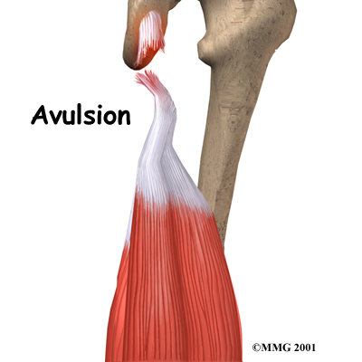 In rare cases, an injury can cause the muscle and tendons to tear away from the bone. This happens most often where the hamstring tendons attach to the ischial tuberosity. These tears, called avulsions, sometimes require surgery.