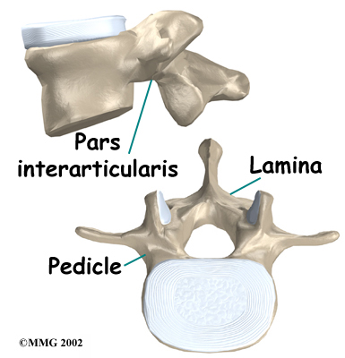 Two sets of bones form the spinal canal's bony ring. Two pedicle bones attach to the back of each vertebral body. Two lamina bones complete the ring. The place where the lamina and pedicle bones meet is called the pars interarticularis, or pars for short. There are two such meeting points on the back of each vertebra, one on the left and one on the right. The pars is thought to be the weakest part of the bony ring.