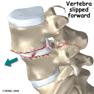 Normally, the bones of the spine (the vertebrae) stand neatly stacked on top of one another. Ligaments and joints support the spine. Spondylolisthesis alters the alignment of the spine. In this condition, one of the spine bones slips forward over the one below it. As the bone slips forward, the nearby tissues and nerves may become irritated and painful.