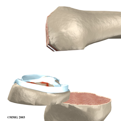 This cutting guide is used to ensure that the bone is cut in the proper alignment to the leg's original angles, even if the arthritis has made you bowlegged or knock-kneed. With the help of the cutting guide, the surgeon cuts several pieces of bone from the end of the femur.