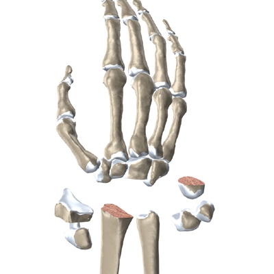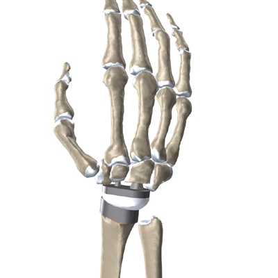 The part that replaces the small wrist bones is called the distal component. This piece is made completely of metal. It is globe shaped to fit into the plastic socket on the end of the radius. The metal distal component is attached by two metal stems that fit into the hollow bone marrow cavities of the carpal and metacarpal bones of the hand.