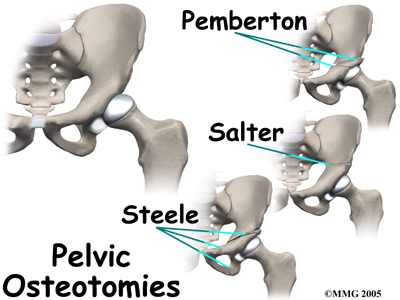 Realignment of the acetabulum is called a pelvic osteotomy. This procedure changes the angle of the acetabulum (socket) so that it better covers, or contains, the femoral head. To perform this procedure, an incision is made in the side of the buttock. The bone of the pelvis is cut and realigned in a new position. Large metal pins or screws are then inserted to hold the bones in the new position until the bone has healed. The pins usually must be removed once the bone has healed.