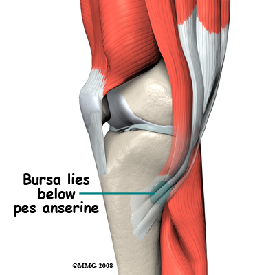 The pes anserine bursa is the main area affected by this condition. The pes anserine bursa is a small lubricating sac between the tibia (shinbone) and the hamstring muscle. The hamstring muscle is located along the back of the thigh.