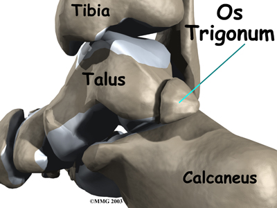 In some people the lateral tuberosity is not united to the talus. The separate piece of bone is called an os trigonum. This separation of the os trigonum from the talus is usually not a fracture. About 15 percent of people have an os trigonum. An os trigonum sometimes causes problems of impingement in the back of the ankle.