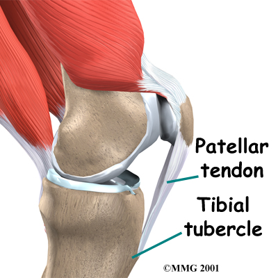 The patellar tendon is a thick and strong band of connective tissue on the front of the knee. It starts at the bottom of the patella and fastens just below the knee to a bony bump on the front of the tibia, called the tibial tubercle. When using the patellar tendon as an ACL graft, surgeons remove a strip from the middle of it. The graft includes the bony attachments from the bottom of the patella and from the tibial tubercle.