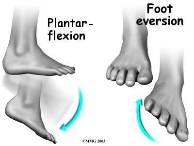 The tendons of the peroneal muscles pass together through a groove behind the lateral malleolus. The tendons are kept within the groove by a sheath that forms a tunnel around the tendons. The surface of this sheath is reinforced by a band of ligament called a retinaculum. Contracting the peroneals makes the tendons glide in the groove like a pulley. This pulley action points the foot downward (plantarflexion) and outward (eversion).