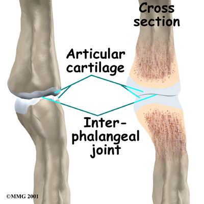 Injury to a joint, such as a bad sprain or fracture, can cause damage to the articular cartilage. An injury to any of the joints of the fingers, even if it does not injure the articular cartilage directly, can alter how the joint works. After a fracture, the bone fragments may heal in slightly different positions. This may make the joints line up differently. When an injury changes the way the joint lines up and moves, force can start to press against the surface of the articular cartilage. This is similar to how a machine that is out of balance wears out faster.