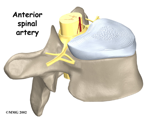 Blood vessels that run up and down the spine nourish the spinal cord. However, only one vessel, the anterior spinal artery, goes to the front of the spinal cord in the area between T4 and T9. Doctors call this section of the spine the critical zone. If this single vessel is damaged, as can happen with pressure from a herniated thoracic disc, the spinal cord has no other way to get blood. Left untreated, this section of the spinal cord dies, which can lead to severe problems of weakness or paralysis below the waist.