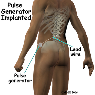 Spinal cord stimulation can be thought of as blocking the pain signal as it travels up the spinal cord to the brain. The small stimulator device is similar to a pacemaker and is implanted underneath the skin, usually in the lower abdomen or upper buttock. The device is connected to special electrodes that are positioned over the back of your spinal cord by wires placed inside the spinal canal. The stimulator device delivers an electrical current to the electrodes that interrupts the conduction of the pain signal, replacing the pain with a tingling, or buzzing sensation, which is often soothing. The electrical stimulation serves as a distraction and allows your brain to focus on the tingling rather than the painful pain signals.