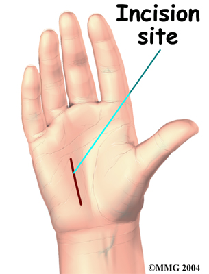 A small incision is made in the palm of the hand over the spot where the nerve goes through the canal.