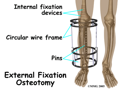 A tibial osteotomy is done before permanent damage occurs. In an osteotomy, a wedge-shaped piece of bone is removed from the medial side of the femur (thigh bone). It's then inserted into the tibia to replace the broken down inner edge of the bone. Hardware such as pins and screws may be used to hold everything in place. If the fixation is used inside the leg, it's called internal fixation osteotomy. External fixation osteotomy describes a special circular wire frame on the outside of the leg with pins to hold the device in place.