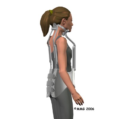 If your doctor is concerned that the curve will worsen, he or she may suggest bracing along with exercise. A brace is most effective when used before the skeleton matures at about age 14. Doctors commonly chose a Milwaukee brace, which is made of molded plastic that conforms to the waist and is designed to hold the shoulders back and gradually straighten the thoracic curve. On the back, two upright, padded bars line up along the sides of the spine. Pressure from the upright bars straightens the spine. The brace won't reverse the curve in a fully developed spine, nor is it helpful for rigid curves that angle more than 75 degrees.