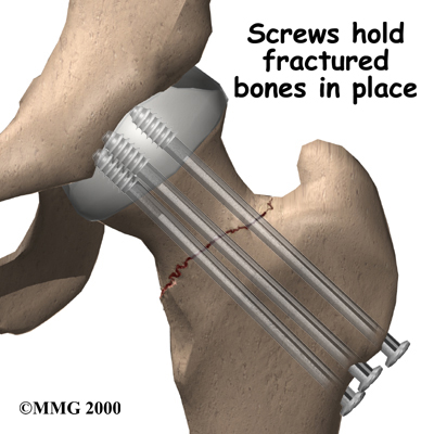 The surgical procedure is the same whether the stress fracture is stable or there is only a slight displacement of the bones. If your surgeon recommends surgery for a stress fracture of the hip, several large metal screws will be inserted through the femoral neck to hold the fractured bones in place while the fracture heals.