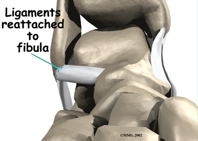 A large band of connective tissue crosses the front of the ankle just below the lateral ligaments. This band, called the ankle retinaculum, holds the tendons in place. The surgeon pulls the top edge of the ankle retinaculum upward and sews it into the fibula. This helps reinforce the reconstructed ligaments.