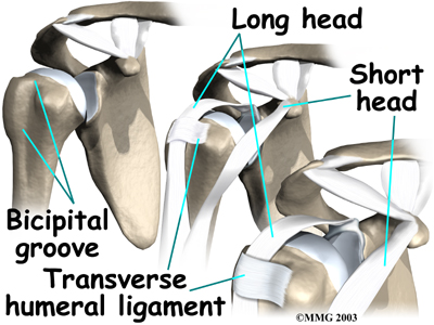 Beginning at the top of the glenoid, the tendon of the long head of the biceps runs in front of the humeral head. The tendon passes within the bicipital groove of the humerus and is held in place by the transverse humeral ligament. This design of the anatomy keeps the humeral head from sliding too far up or forward within the glenoid.