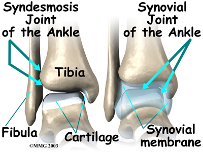 Most joints in the body are synovial joints. Synovial joints are enclosed by a ligament capsule and contain a fluid, called synovium, that lubricates the joint. The ankle syndesmosis sits next to the ankle synovial joint, where the tibia meets the talus bone.