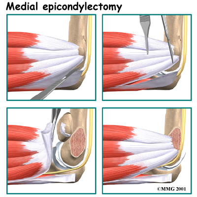 The other method simply removes the medial epicondyle on the inside edge of the elbow, a procedure called medial epicondylectomy. By getting the medial epicondyle out of the way, the ulnar nerve can then slide through the cubital tunnel without pressure from the bony bump.