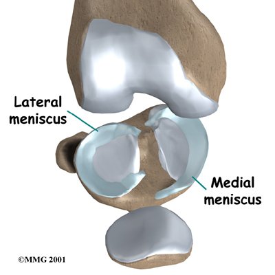 The menisci (plural for meniscus) protect the articular cartilage on the surfaces of the thighbone (femur) and the shinbone (tibia). Articular cartilage is the smooth, slippery material that covers the ends of the bones that make up the knee joint. The articular cartilage allows the joint surfaces to slide against one another without damage to either surface.