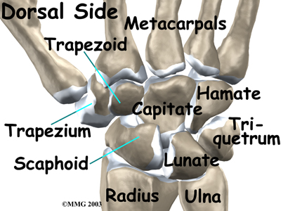 the proximal row of four bones sits next to the forearm (radius and ulna), and the distal row of four bones connects to the metacarpal bones. These two rows of bones work together like the links in a chain to allow the hand to move up (dorsiflex) and down (palmarflex). The connections between each carpal bone also allow the bones to shift as the hand is moved sideways (radial deviation and ulnar deviation).