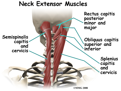 Your doctor may want to repeat imaging of the spine. There is the possibility of over stretching or pinching the spinal cord when the neck extensors are so weak. You will need to watch for symptoms such as weakness or numbness in the arms or other portions of the body. Bowel and bladder function could become a problem.