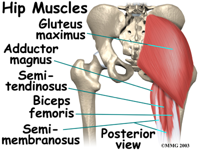 The hip is surrounded by thick muscles. The gluteals make up the muscles of the buttocks on the back of the hip. The inner thigh is formed by the adductor muscles . The main action of the adductors is to pull the leg inward toward the other leg.