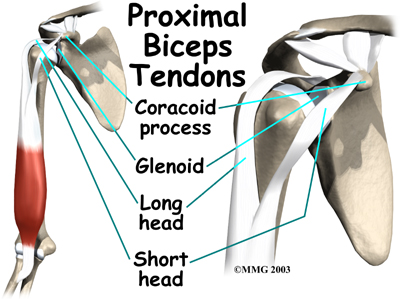 The upper (proximal) end of the biceps has two attachments to the shoulder. The main attachment is the long head of the biceps. It connects the biceps muscle to the top of the shoulder socket, called the glenoid. The short head of the biceps angles up and in to its attachment on the corocoid process of the shoulder blade. The corocoid process is a small bony knob in the front of the shoulder.