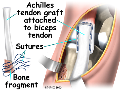 When the Achilles tendon allograft is used, the surgeon leaves a small piece of the heel bone attached to the piece of tendon. Small holes are drilled into the piece of bone. Sutures are woven through these holes and will later be used to secure the end of the graft to the radial tuberosity. In this way, the graft will have a bone-to-bone connection that heals together. The healed bone solidly fixes the the graft to the radial tuberosity. After the graft is in place, its top end is then stitched over the front of the biceps muscle.