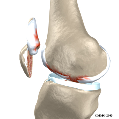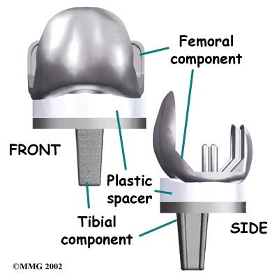 The tibial component (bottom portion) replaces the top surface of the lower bone, the tibia. The femoral component (top portion) replaces the bottom surface of the upper bone (the femur) and the groove where the patella fits. The patellar component (kneecap portion) replaces the surface of the patella where it glides in the groove on the femur.