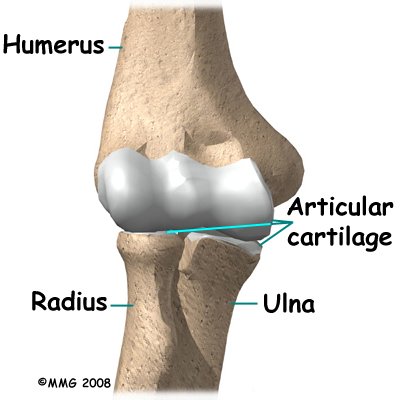 Articular cartilage is the material that covers the ends of the bones in a joint. Articular cartilage can be up to one-quarter of an inch thick in the large, weight-bearing joints. It is a bit thinner in joints such as the elbow, which don't support weight. Articular cartilage is white, shiny, and has a rubbery consistency. It is slippery, which allows the joint surfaces to slide against one another without causing any damage. In the elbow, articular cartilage covers the end of the humerus, the end of the radius, and the end of the ulna.