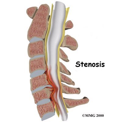 Stenosis means closed in. Spinal stenosis refers to a condition in which the spinal cord is closed in, or compressed, inside the tube of the spinal canal. Spinal stenosis may be caused by degenerative changes, such as bone spurs pushing against the spinal cord within the spinal canal.