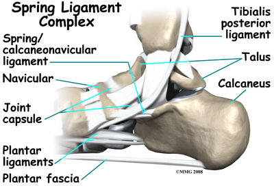 The spring ligament complex is often involved in AAFD. This group of ligaments supports the talonavicular joint. The spring ligament complex works with the posterior tibial tendon and the plantar fascia to support and stabilize the longitudinal arch of the foot.