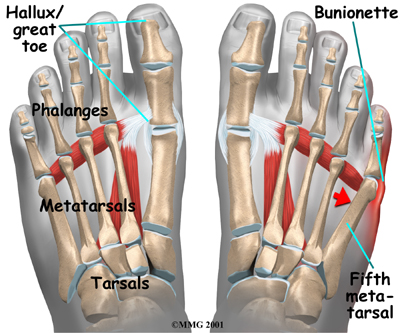 A bunionette occurs over the area of the foot where the small toe connects to the foot. This area is called the metatarsophalangeal joint, or MTP joint. The metatarsals are the long bones of the foot. The phalanges are the small bones in each toe. The big toe has two phalanges, and the other toes have three phalanges each.
