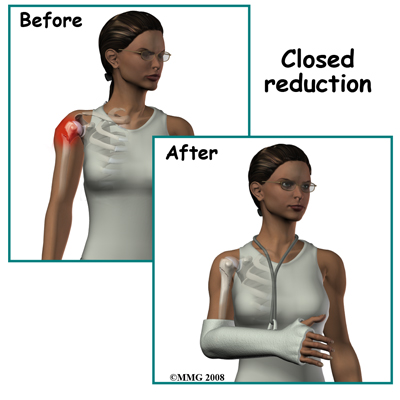 In some cases a closed reduction is needed followed by splinting. Under anesthetic, but without opening up the fracture site, the fracture (or dislocation) is manipulated into a better position and alignment. This is typical treatment for glenohumeral dislocation.