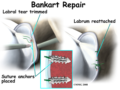 The most common method for surgically stabilizing a shoulder that is prone to anterior dislocations is the Bankart repair. In the past, the Bankart repair was done through a large incision made in the front (anterior) shoulder joint. This required damage to a great deal of normal tissue in order for the surgeon to be able to see the damaged portion of the joint capsule. The procedure was difficult and usually involved an attempt to sew or staple the ligaments on the front side of the joint back into their original position.