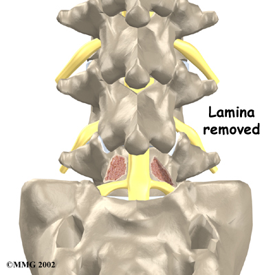 When the vertebra slips forward, the nearby nerves that exit the spine can become pinched or irritated. In addition, the size of the spinal canal in the problem area shrinks, placing pressure on the nerves inside the canal. To fix this, the lamina of the bony ring is removed to ease pressure on the nerves. The procedure to remove the lamina and release pressure on the nerves is called laminectomy. Decompression alone is usually not advised. Studies show much better results when the operation is combined with a fusion of the involved vertebrae (see below).