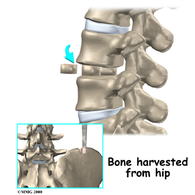 Anterior lumbar interbody fusion surgery is done through the abdomen, allowing the surgeon to work on the anterior (front) of the lumbar spine. Removing the disc (discectomy) leaves a space between the pair of vertebrae. This interbody space is filled with a bone graft. One method is to take a graft from the pelvic bone and tamp it into place. Another method involves inserting two hollow titanium screws packed with bone, called fusion cages, into the place where the disc was taken out. The bone graft inside the cages fuses with the adjacent vertebrae, forming one solid bone.