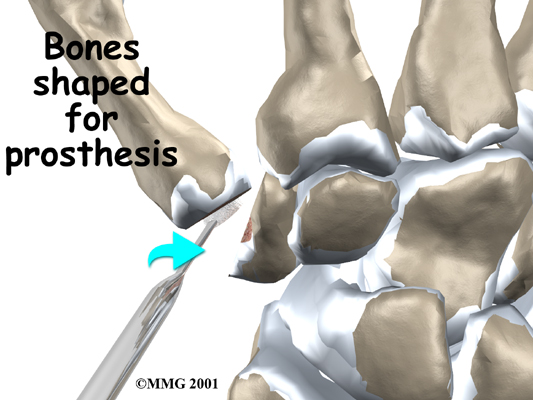 A burr is used to make a small notch, or canal, in the ends of the two bones. The surgeon shapes the notch so the ball-shaped implant will fit snugly in the joint. The implant is placed between the ends of the shaped bones.