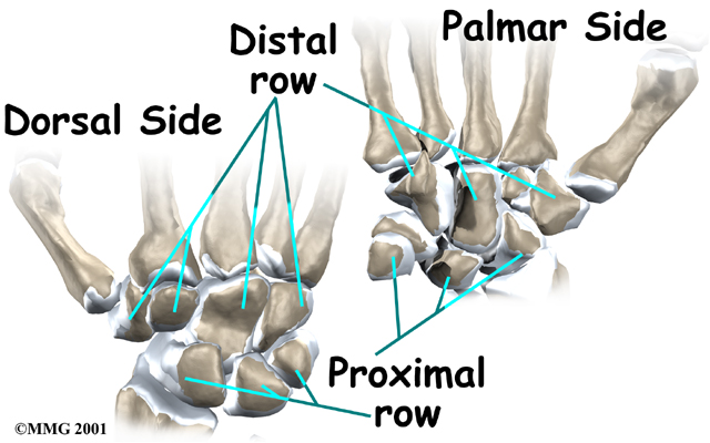 the proximal row of four bones sits next to the forearm (radius and ulna), and the distal row of four bones connects to the metacarpal bones. These two rows of bones work together like the links in a chain to allow the hand to move up (dorsiflex) and down (palmarflex). The connections between each carpal bone also allow the bones to shift as the hand is moved sideways (radial deviation and ulnar deviation).