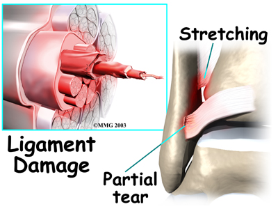 An ankle syndesmosis injury involves a sprain of one or more of the ligaments that support the ankle syndesmosis. A ligament is made up of multiple strands of connective tissue, similar to a nylon rope. A sprain stretches or tears the ligaments. Minor sprains only stretch the ligament. A tear may be either a complete tear of all the strands of the ligament or a partial tear of only some of the strands. The ligament is weakened by the injury. How much it is weakened depends on the degree of the sprain.