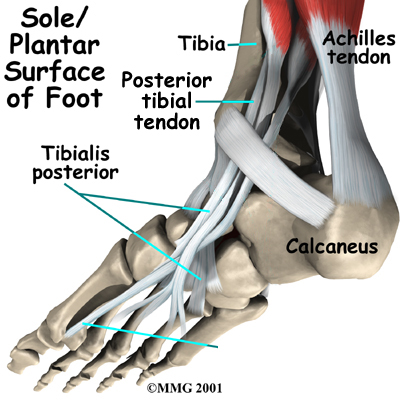 The posterior tibial tendon runs behind the inside bump on the ankle (the medial malleolus), across the instep, and into the bottom of the foot. The tendon is important in supporting the arch of the foot and helps turn the foot inward during walking.
