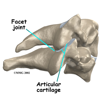 There are two facet joints between each pair of vertebrae--one on each side of the spine. The surfaces of the facet joints are covered by articular cartilage. Articular cartilage is a smooth, rubbery material that covers the ends of most joints. It allows the bone ends to move against each other smoothly, without pain. The alignment of the facet joints of the cervical spine allows freedom of movement as you bend and turn your neck.