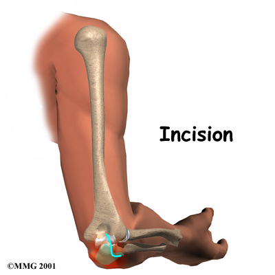 To remove the olecranon bursa, an incision is made over the tip of the elbow. Since the bursa is outside of the elbow joint, the joint is never entered. The thickened bursa sac is removed, and the skin is repaired with stitches. Your elbow may be placed in a splint to rest the elbow and prevent it from moving for a few days. This allows the wound to begin to heal and prevents bleeding into the area where the bursa was removed.