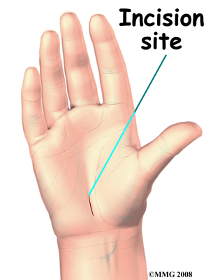 After dividing the transverse carpal ligament, the surgeon stitches just the skin together and leaves the loose ends of the transverse carpal ligament separated. The loose ends are left apart to keep pressure off the median nerve. Eventually, the gap between the two ends of the ligament fills in with scar tissue.