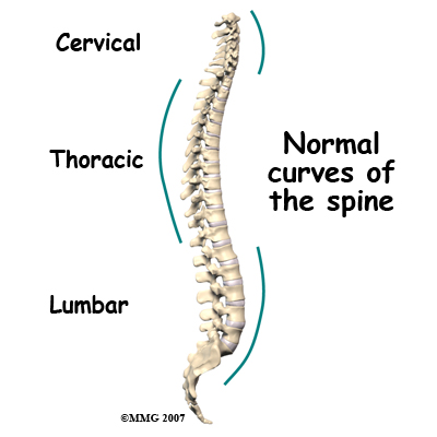 The vertebra stack on top of one another and are separated by discs. The spine has normal curves. When looking at the spine from the side, the spinal column is not straight up and down, but forms an S curve. The cervical spine has an inward curve called a lordosis. The thoracic spine curves outward. This curve is called a kyphosis. The lumbar spine usually has an inward curve or a lordosis. The S curve seen in the side view allows for shock-absorption and acts as a spring when the spine is loaded with weight. This S curve maintains balance of the spine in a forward and backward plane.