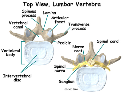 The spine is made up of 24 bones called vertebrae that stack on top of one another. Each vertebra has a ring of bone that encases and protects the spinal cord. When the vertebrae are stacked one on top of the other, these rings of bone create a hollow tube called the spinal canal. The spinal cord runs through the spinal canal from the brain to the lower spine. Between the vertebrae are intervertebral discs. The intervertebral discs cushion the spine and make it flexible. There are also two facet joints between each vertebra of the spine. The facet joints are located on the back of the spinal column in the lumbar and thoracic spine. In the neck, or cervical spine, they are located more to the side of the vertebra.