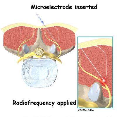Radiofrequency ablation is done with the help of fluoroscopic guidance. The fluoroscope is an x-ray machine that allows the doctor to actually see an x-ray image while doing the procedure. This allows the doctor to watch where the needle electrode goes as it is inserted. This makes placing the electrode much safer and much more accurate. In performing radiofrequency ablation, your doctor inserts a needle electrode near the facet joint so that the tip of the needle is very near the medial branch nerve that travels to the facet joint. Once your doctor is sure that the tip of the needle is in the right place, the tip of the needle is heated to cauterize and destroy the nerve. Once the nerves carrying the sensation from the painful joints are destroyed, your pain should be reduced.