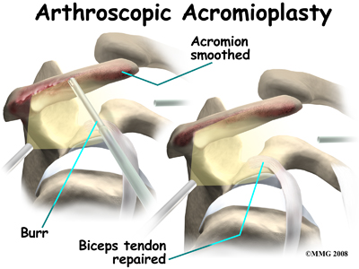 Today, acromioplasty is usually done using an arthroscope. An arthroscope is a slender tool with a tiny TV camera on the end. It lets the surgeon work inside the joint through a very small incision. This may result in less damage to the normal tissues surrounding the joint, leading to faster healing and recovery.
